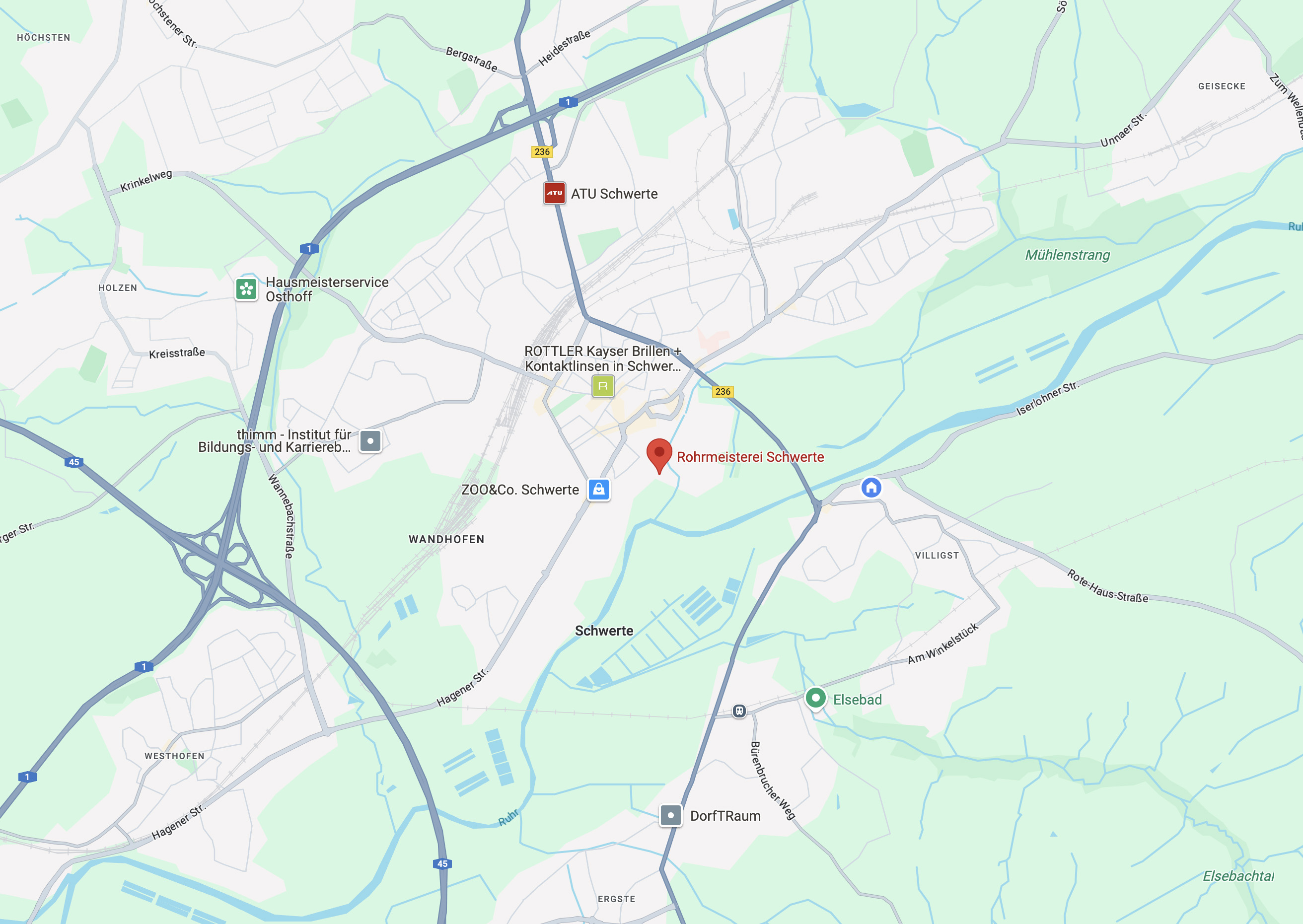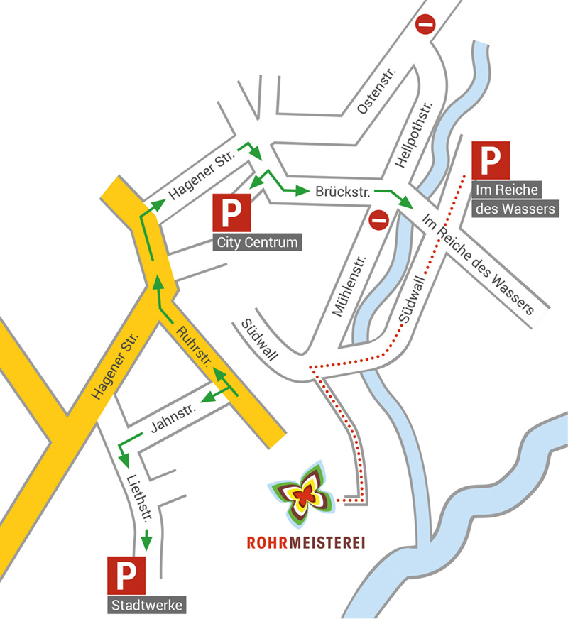 A 1 bis „Schwerte“- B 236 („Hörder Str.“) Richtung „Zentrum“- nach den Bahnunterführungen an der Ampel nicht nach links der Vorfahrt folgen, sondern rechts in die „Karl-Gerharts-Str.“ einbiegen - nächste Ampelkreuzung geradeaus (rechts Bahnhof, Straße beschreibt dann Linksbogen, „Beckestr.“) - am Ende der „Beckestr.“ (Penny-Markt gegenüber) links abbiegen („Hagener Str.“) - danach 2. Strasse rechts abbiegen: „Ruhrstr.“ (an der Ecke ist die Polizeiwache, Ausschilderung „Rohrmeisterei“) - am Ende der Straße ist die Rohrmeisterei mit Parkplatz - dort bitte parken!